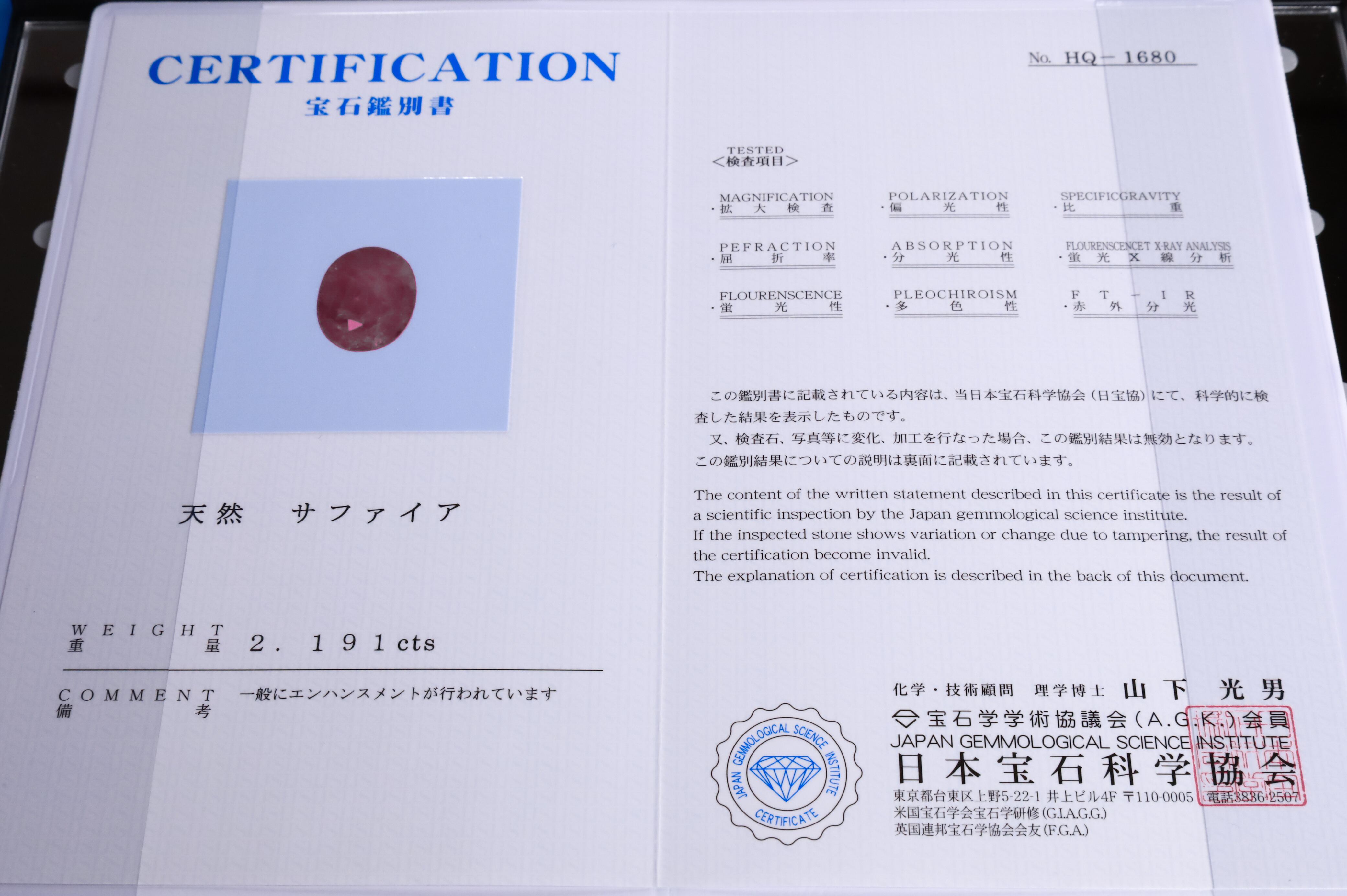 ※画像の鑑別書は同じロットの別個体のもので、コチラには付属しません。