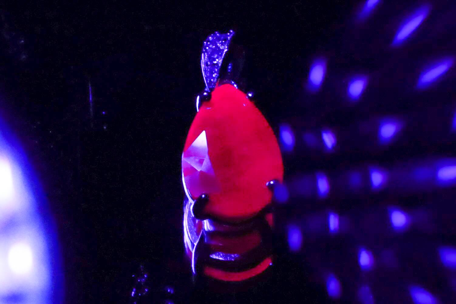 半透明で、天然石特有のインクルージョン、キズ、クラックなどありますが直ぐに壊れるようなものではなく、通常光下でもパープルやピンクも感じる赤の色味が美しく、ブラックライトを使用すると、メイン画像のような綺麗な赤い(実際は画像のピンク感をもう少し赤に寄せた感じです)蛍光性もお楽しみいただけます。